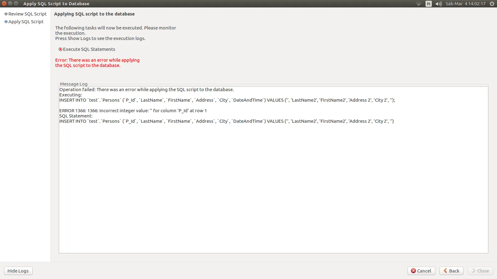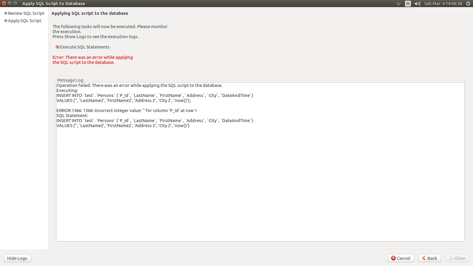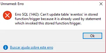 Esse código de erro 1442 tem haver com sua trigger, procure pesquisar sobre esses códigos, é a forma que a base te informa dos erros ocorridos…