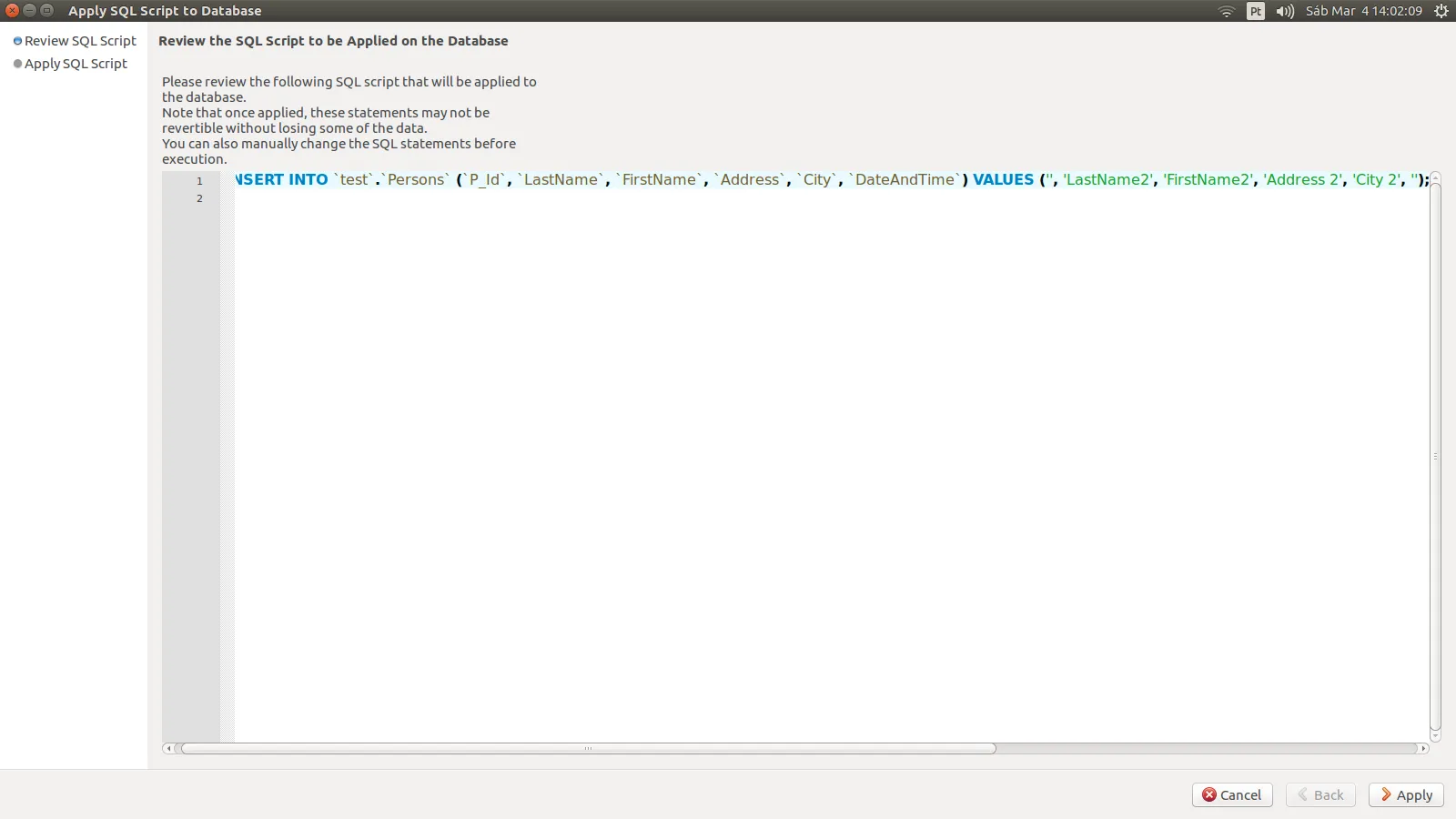 Está utilizando MySQL WorkBench (pelo Print parece que sim…)?