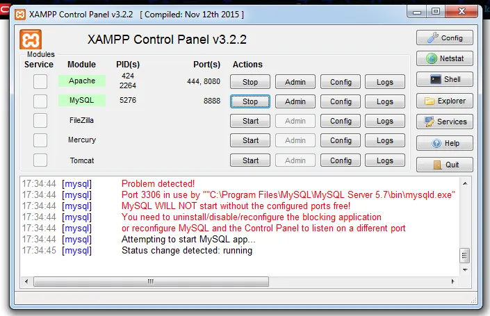 A mensagem de erro é clara: a porta 3306 do MySQL está em uso por outra instalação do MySQL, e o MySQL do Xampp não está conseguindo rodar.