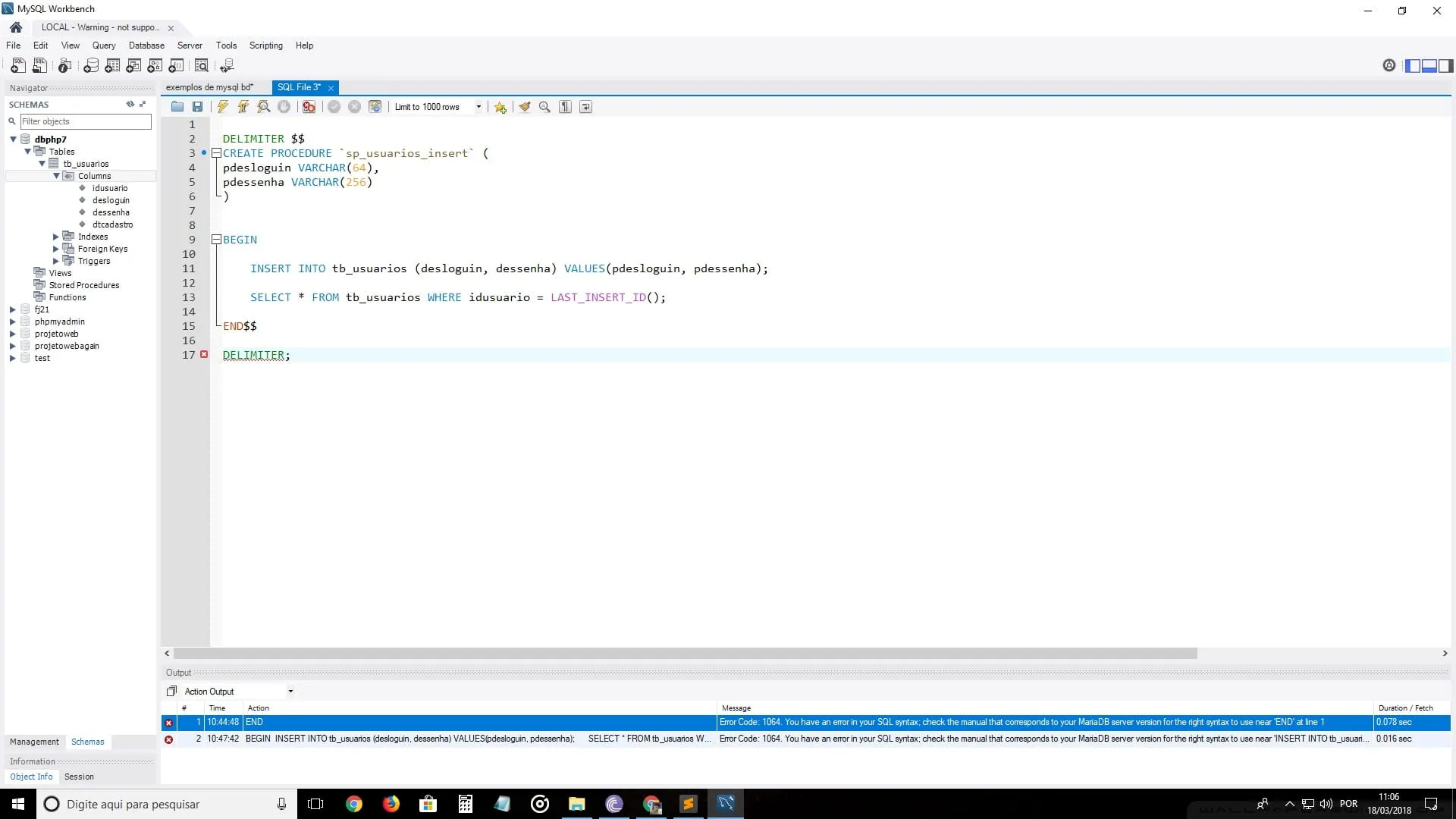 Olhe a linha 17, o Workbench informa um erro, e pelo que vi, o erro 1064 é que o comando não pode ser identificado.