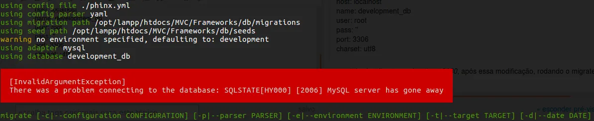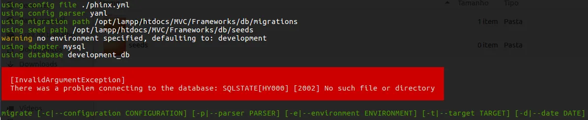 Estou aprendendo PHP e comecei a aprender a usar a framework Phinx, porém, toda via, entretanto, ao dar o comando vendor/bin/phinx migrate o terminal retorna a seguinte mensagem: