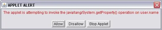Estou tentando instalar o plugin UML para eclipse mas estou tento um problema. Durante toda instalação fica aparecendo uma mensagem “APPLET ALERT - The applet attempting to invoke the java/lang/System.getProperty() operation on user.name”.