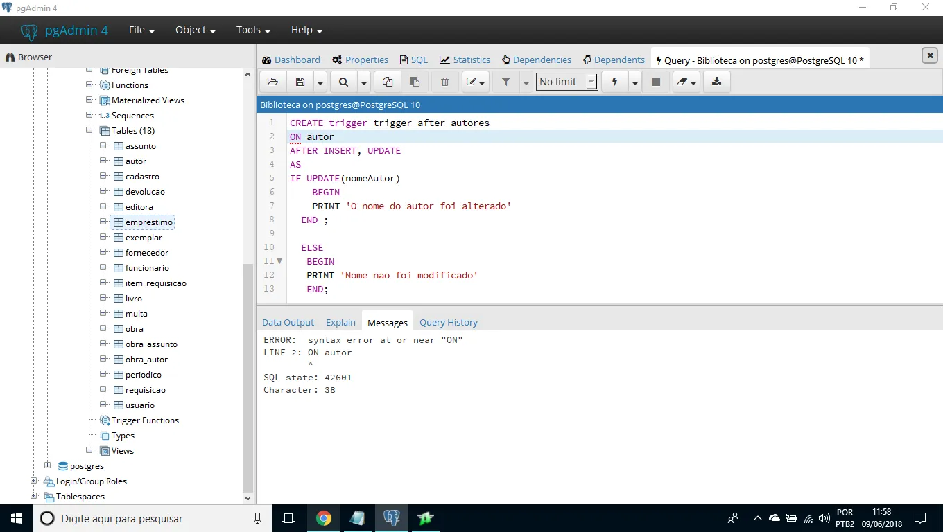 Por exemplo a mensagem de erro é clara: esse “ON” não deveria estar aí. Olhando a documentação, você verá que não existe esse ON na sintaxe do Postgre.