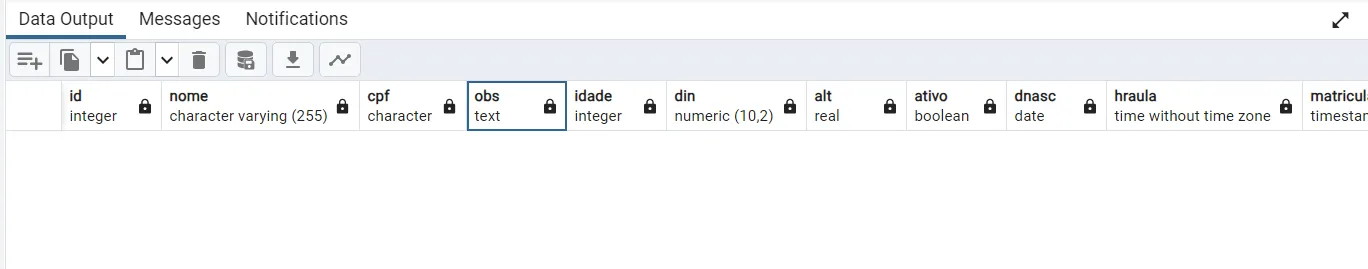 Veja também se, após fazer o insert, é preciso fazer um commit, que efetivamente grava as alterações (insert, update, delete) no banco. Pode ser que o pgAdmin não faça o commit por padrão, então nada está sendo gravado, e consequentemente nada vai retornar no select.