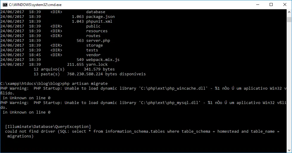Estou a criar um projeto no Laravel, e inicio o server normalmente, mas quando entro com o comando: php artisan migrate ele retorna um erro no driver do mysql. Procurei o arquivo dll do mysql, e por padrão ele não está na pasta ext do meu php (tenho o php7, pelo que pesquisei esse comando está depreciado desde a v5.5).