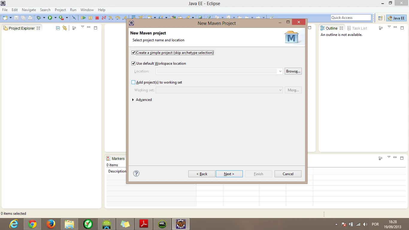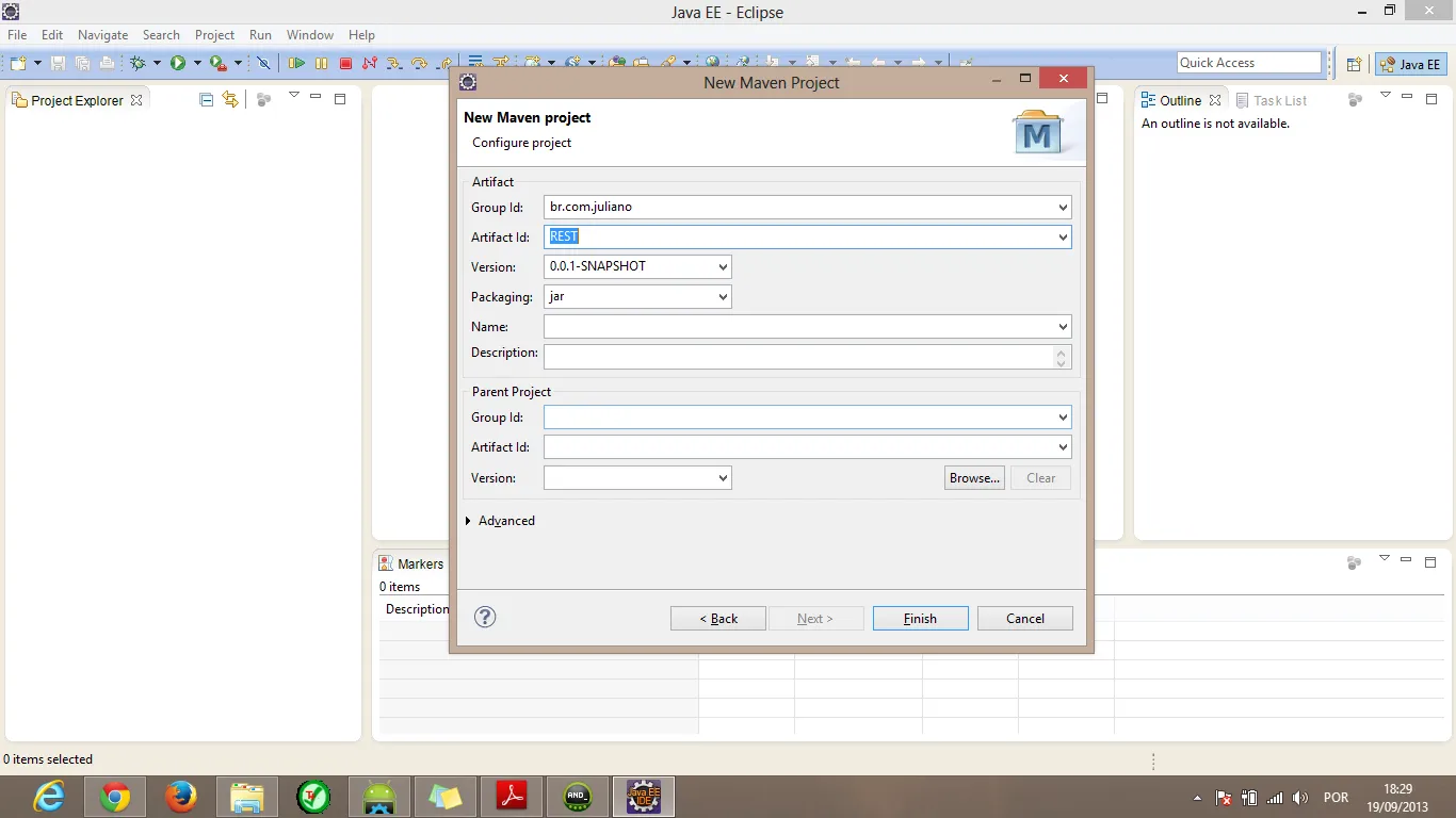 abra o Eclipse novamente File > New > Maven Project, marque “Create a simple project”, dê Next, informe o: GroupId, Artifact Id, Packaging war, e Name, então dê Finish.