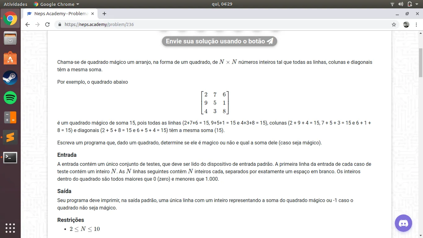 Quando submeto meu código a plataforma me diz que minha solução está incorreta, mas testando com os casos oferecidos ele funciona perfeitamente. Na plataforma também é possível ver que outras pessoas enviaram o código e a plataforma aceitou.