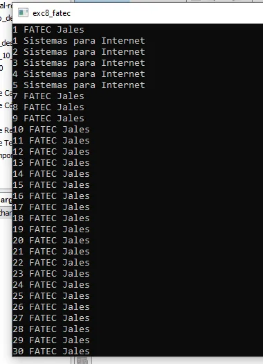 Olá, a todos! :upside_down_face: Pessoal estou com um problema e eu preciso do auxílio de vocês já quebrei muito a cabeça nessa questão. O que há de errado eu não entendo porque a minha lógica nesse caso não funciona. Vamos lá então. estou desenvolvendo um algoritmo em C que é para repetir a palavra “Fatec” 30 vezes, cada vez que aparecer na tela a palavra Fatec terá que aparecer em seguida 5 vezes a frase “Sistemas para Internet”
