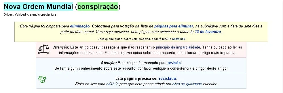 Dei uma olhada em todos os termos citados pela revista, apenas para ter certeza de que eles realmente continham os textos indicados. Um dos termos, Nova Ordem Mundial conspiração não está mais publicado e uma olhada no cache do google mostra porque (vejam anexo).