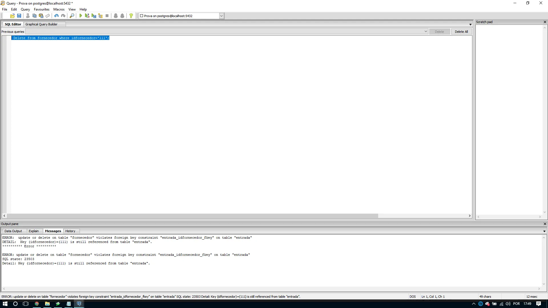 Restrição de chave estrangeira, o fornecedor que você está tentando excluir está contido na tabela entrada, para excluí-lo você deve antes deletar o registro dependente na tabela entrada.