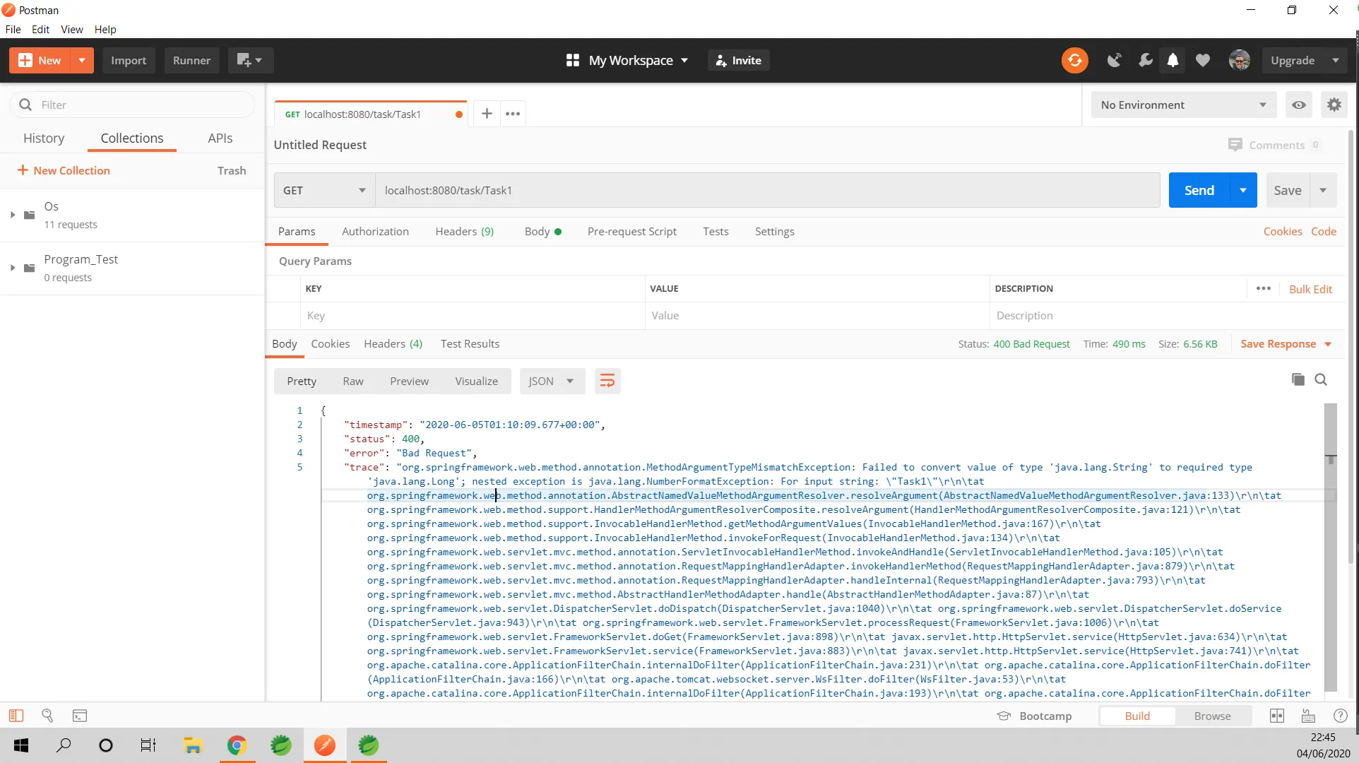 “message”: "Failed to convert value of type ‘java.lang.String’ to required type ‘java.lang.Long’; nested exception is java.lang.NumberFormatException: For input string: “Task1"”,
