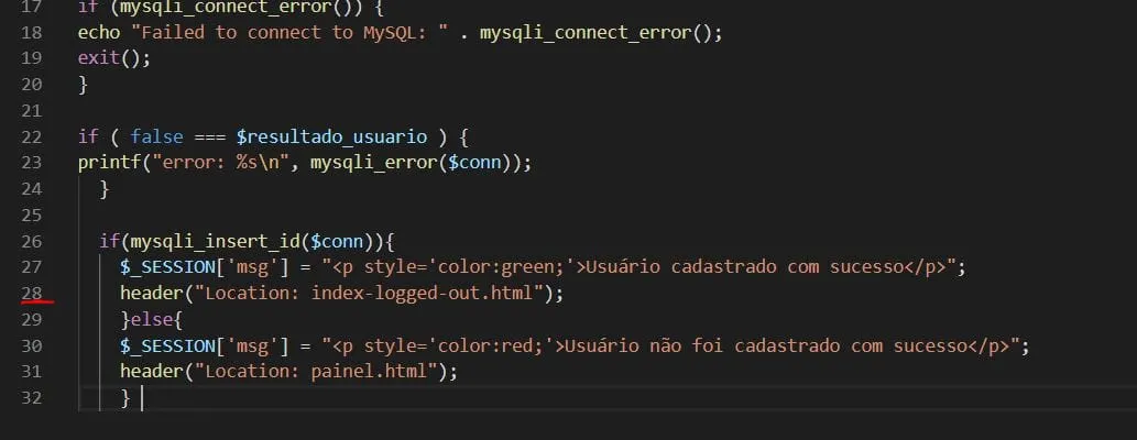 <?phpinclude('conexao.php');$email=filter_input(INPUT_POST,'email');$senha=filter_input(INPUT_POST,'senha');$senha2=filter_input(INPUT_POST,'senha2');echo"email: $email<br>";echo"senha: $senha<br>";echo"senha: $senha2<br>";$result_usuario="INSERT INTO usuarios (email, senha, created) VALUES ('$email', '$senha', NOW())";$resultado_usuario=mysqli_query($conn,$result_usuario);// Check connectionif(mysqli_connect_error()){echo"Failed to connect to MySQL: ".mysqli_connect_error();exit();}if(false===$resultado_usuario){printf("error: %s\n",mysqli_error($conn));}if(mysqli_insert_id($conn)){$_SESSION['msg']="<p style='color:green;'>Usuário cadastrado com sucesso</p>";header("Location: index-logged-out.html");}else{$_SESSION['msg']="<p style='color:red;'>Usuário não foi cadastrado com sucesso</p>";header("Location: painel.html");}
