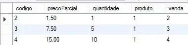 Tabela itemVenda. na tabela itemvenda foi registrado uma venda cuja, o código é 4. Para executar o estorno, se for o caso, o usuário pode remover.