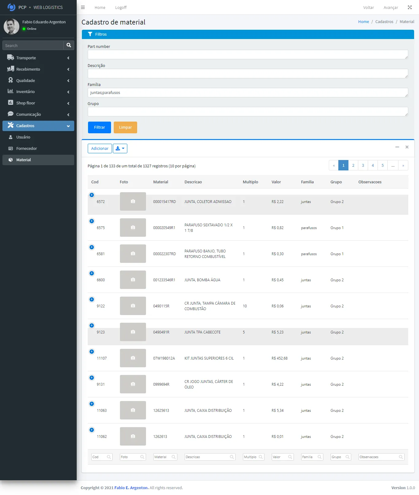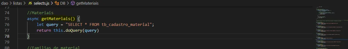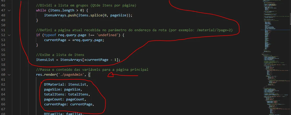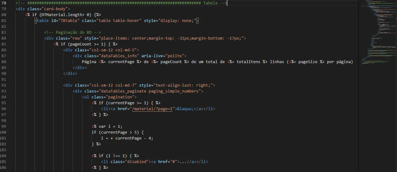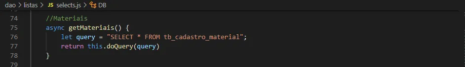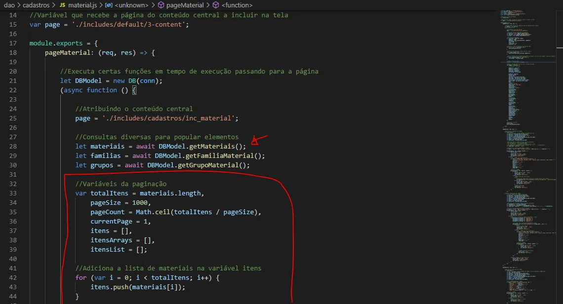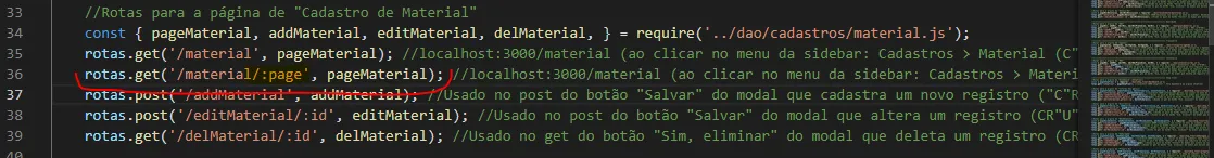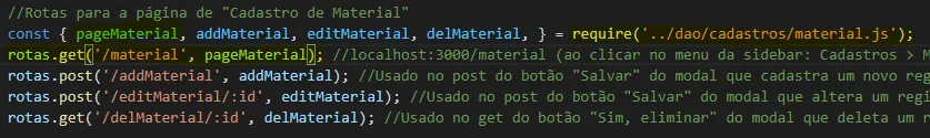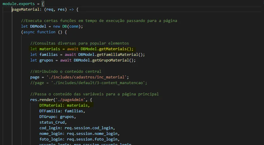 Ao acessar este endereço entramos no arquivo materiais.js que está na pasta dao e que contém a renderização das páginas .ejs , veja abaixo que ao acessar /material entramos na rota pageMaterial, nesta rota tenho uma função que recebe a consulta da tabela materiais e grava na variável materiais e depois passo essa variável materiais para o render da view como DTMaterial: