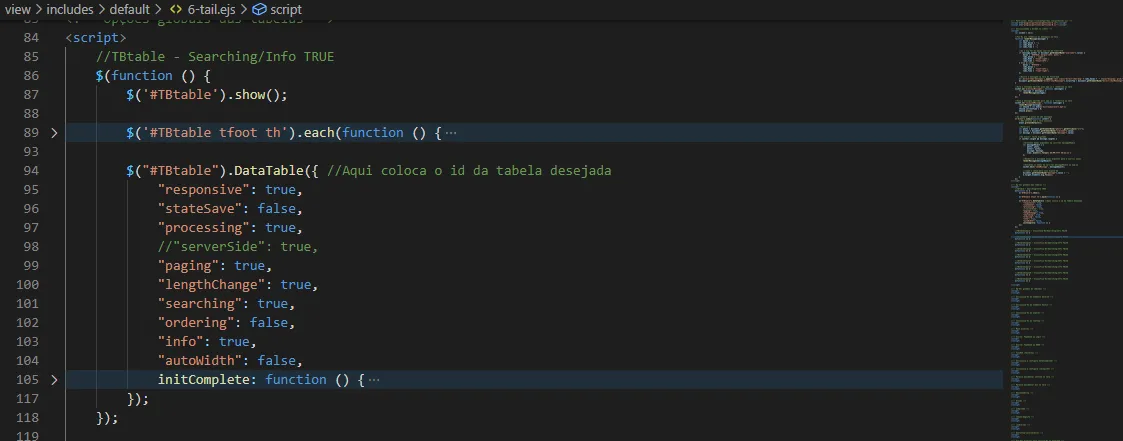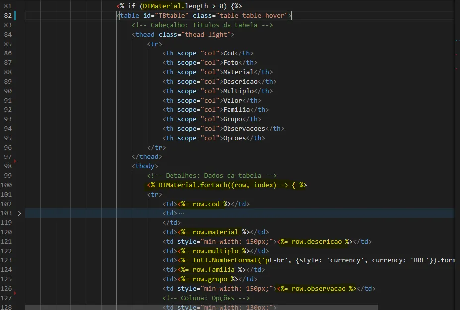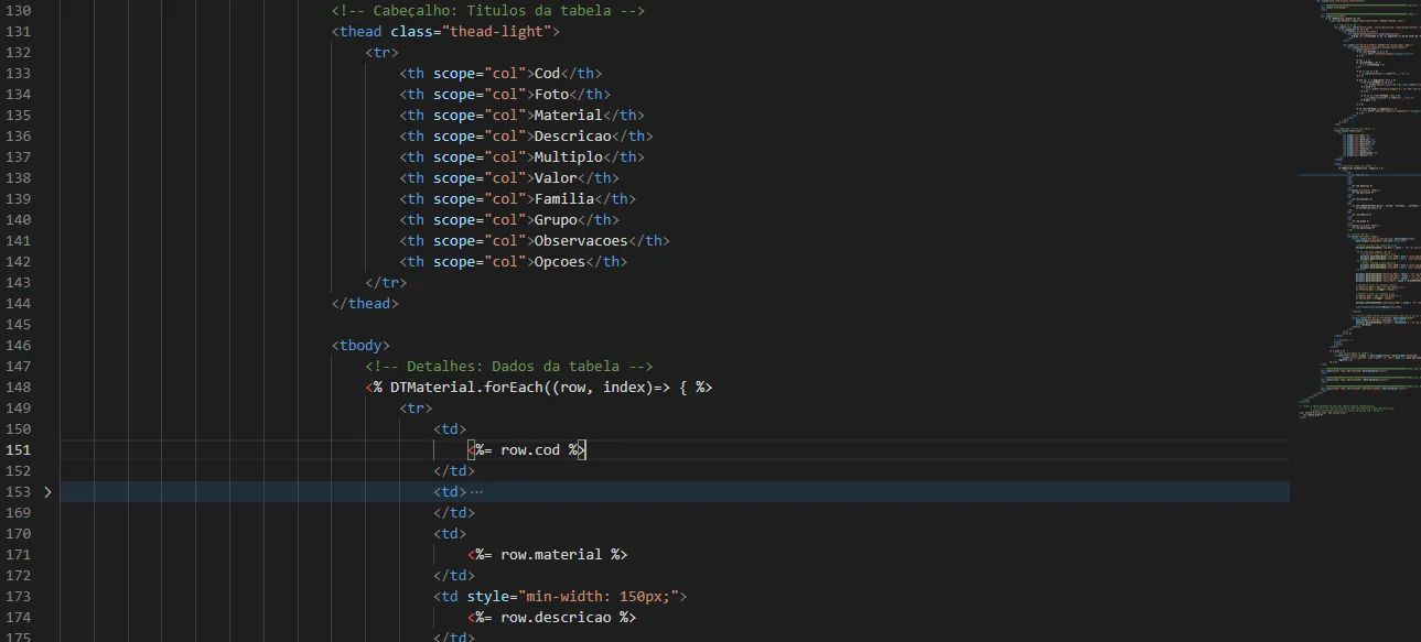 Ai lá na página .ejs que é meu font end recebo o DTMaterial e passo em um forEach populando assim a dataTable, row por row: