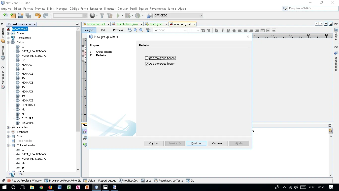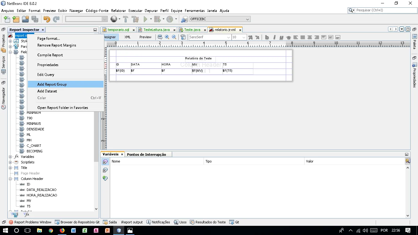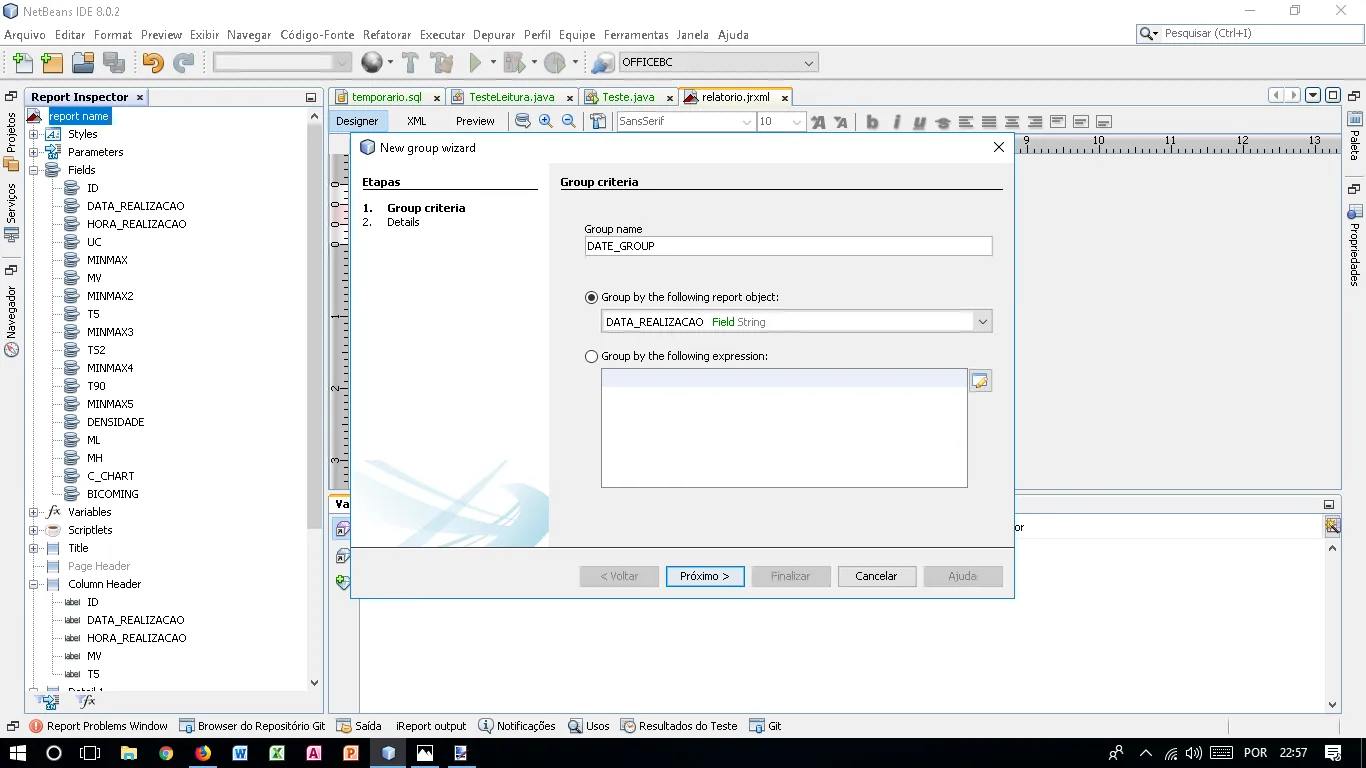 Quero mostrar o total, média, mínimo e máximo de itens por meses do ano…então criamos o grupo para o campo que possui a data, arrastamos o field com o valor que queremos trabalhar, nesse caso a quantidade de itens, a variável é criada e poderemos modifica-la para somar, multiplicar, dividir, subtrair ou então podemos criar códigos personalizados em java para retornar valores como o mínimo e máximo que esse campo alcançou…ficaria mais ou menos assim: