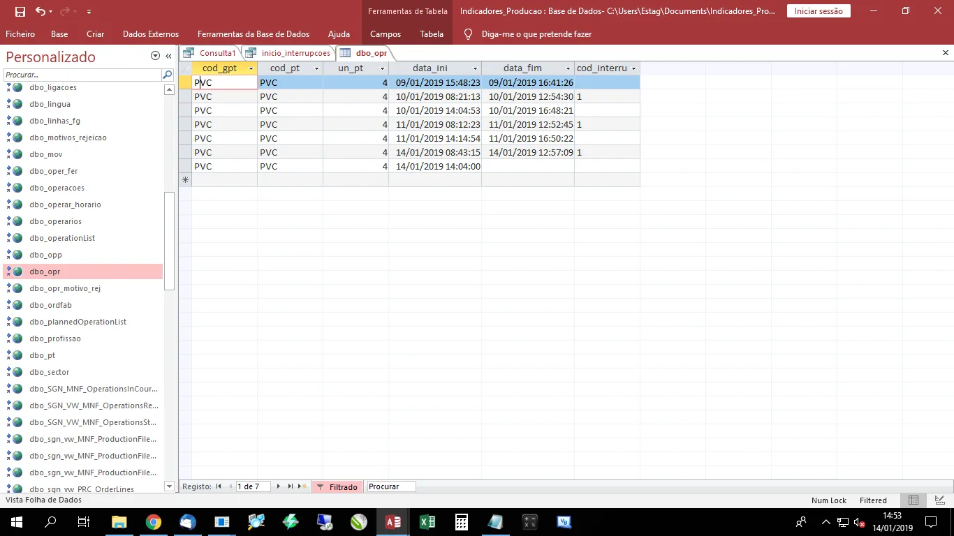 Como o registo tem Cod_interrup considero que 10/01/2019 12:54:30 representa o inicio da interrupção e o próximo inicio neste caso 10/01/2019 14:04:53 será o fim da interrupção e inicio da Produção.