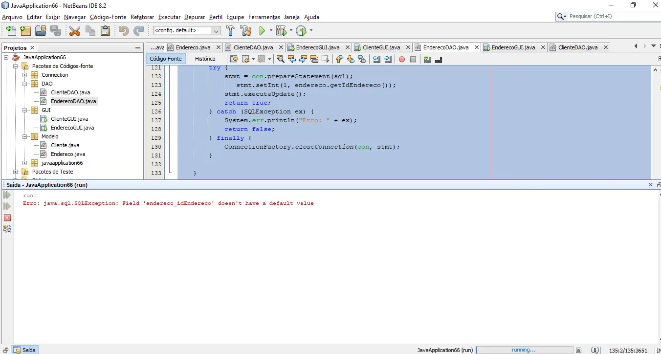 ESSE é p erro que está dando:Erro: java.sql.SQLException: Field ‘endereco_idEndereco’ doesn’t have a default value