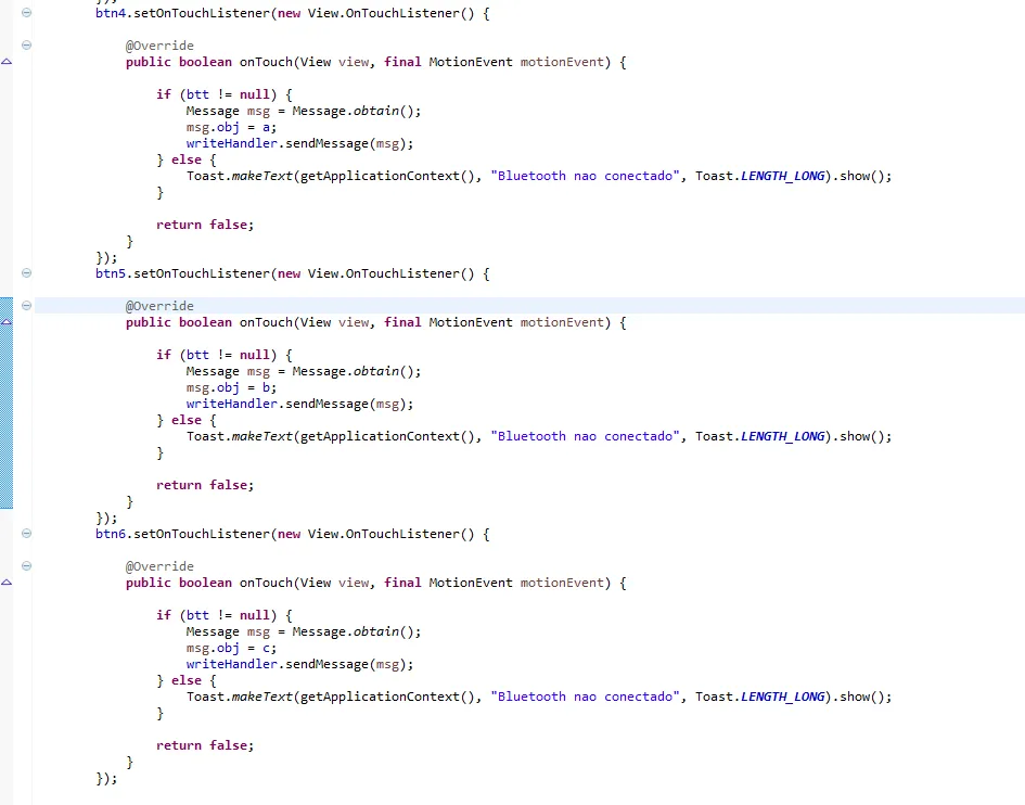 Abaixo o exemplo do meu código dos botoes de onTouch sem switch.