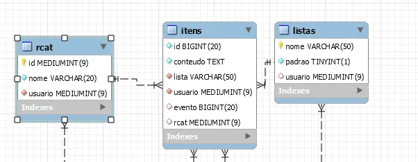 Na tabela itens tem um item com a lista de referências no campo lista, usuário 1 e rcat 1. Mas mesmo assim o SELECT retorna vazio. Alguém sabe me dizer por quê?