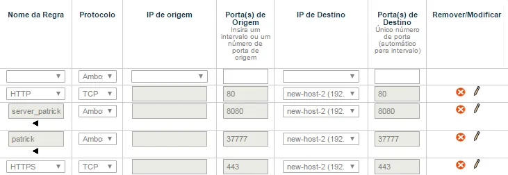 Logo comecei a pensar que poderia ser algum problema no redirecionamento de portas do roteador, então entrei nas configurações dele e adicionei as seguintes portas
