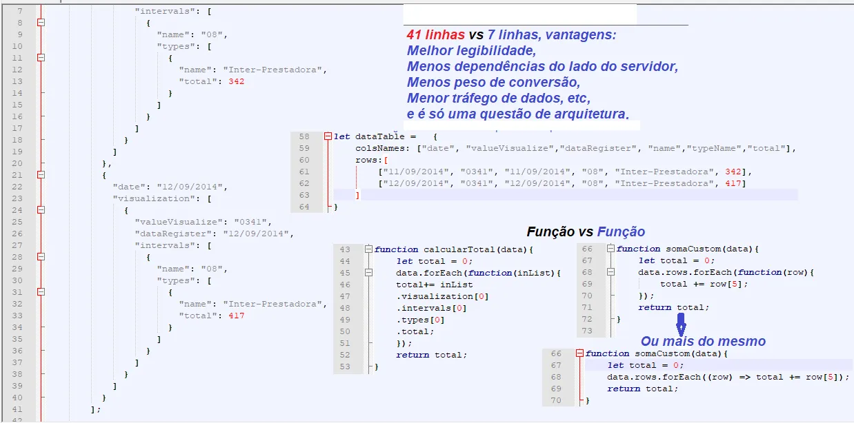@PedreiroDeSoftware entendo que a estrutura do JSON que você propos é mais eficiente para analisar no cliente, mas uma vez me disseram que não é boa prática uma API retornar JSON dessa forma, que o JSON tem que ter significado semântico condizente com o tipo de objeto que está retornando. Que quando você retorna do jeito que você sugeriu ele fica atrelado a uma estrutura de tabela e não poderia ser usado em outros contextos. Voce poderia comentar sobre essas afirmações, por favor?