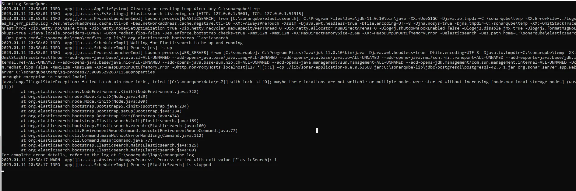 java.lang.IllegalStateException: failed to obtain node locks, tried [[C:\sonarqube\data\es7]] with lock id [0]; maybe these locations are not writable or multiple nodes were started without increasing [node.max_local_storage_nodes] (was [1])?