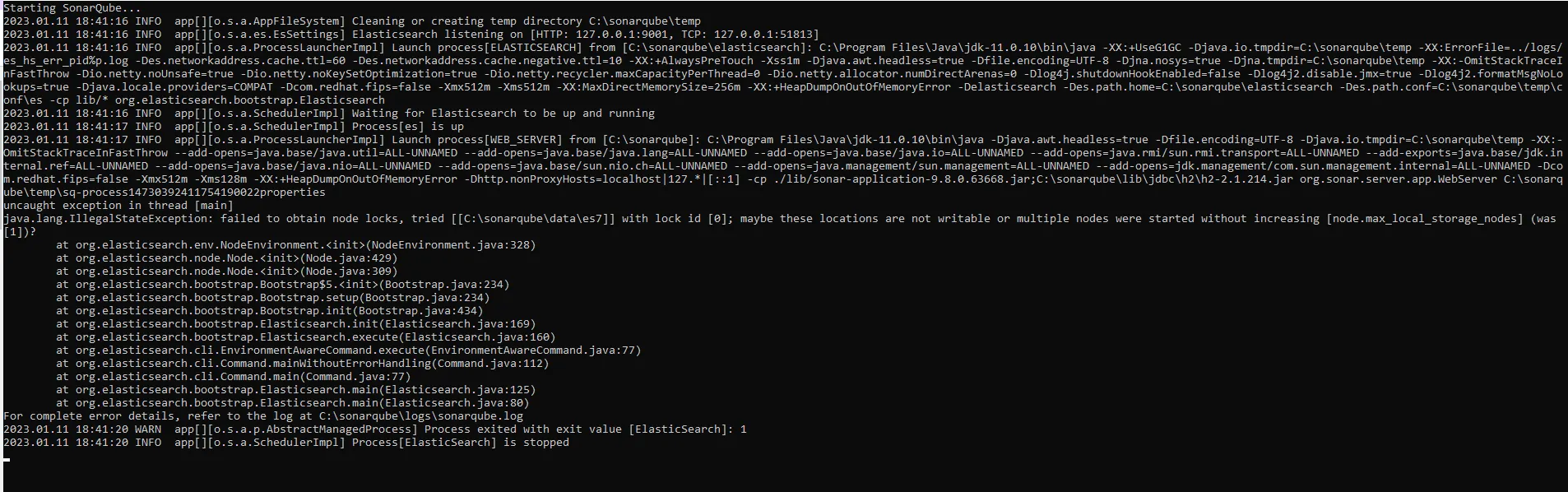 2023.01.11 18:41:16 INFO app[][o.s.a.ProcessLauncherImpl] Launch process[ELASTICSEARCH] from [C:\sonarqube\elasticsearch]: C:\Program Files\Java\jdk-11.0.10\bin\java -XX:+UseG1GC -Djava.io.tmpdir=C:\sonarqube\temp -XX:ErrorFile=../logs/es_hs_err_pid%p.log -Des.networkaddress.cache.ttl=60 -Des.networkaddress.cache.negative.ttl=10 -XX:+AlwaysPreTouch -Xss1m -Djava.awt.headless=true -Dfile.encoding=UTF-8 -Djna.nosys=true -Djna.tmpdir=C:\sonarqube\temp -XX:-OmitStackTraceInFastThrow -Dio.netty.noUnsafe=true -Dio.netty.noKeySetOptimization=true -Dio.netty.recycler.maxCapacityPerThread=0 -Dio.netty.allocator.numDirectArenas=0 -Dlog4j.shutdownHookEnabled=false -Dlog4j2.disable.jmx=true -Dlog4j2.formatMsgNoLookups=true -Djava.locale.providers=COMPAT -Dcom.redhat.fips=false -Xmx512m -Xms512m -XX:MaxDirectMemorySize=256m -XX:+HeapDumpOnOutOfMemoryError -Delasticsearch -Des.path.home=C:\sonarqube\elasticsearch -Des.path.conf=C:\sonarqube\temp\conf\es -cp lib/* org.elasticsearch.bootstrap.Elasticsearch