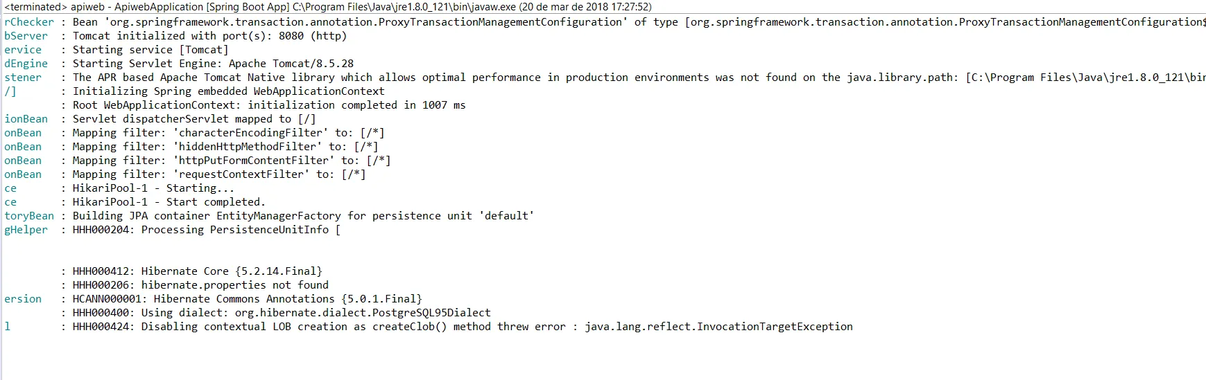 2018-03-19 19:21:39.763  INFO 5172 --- [           main] marco.prova.ApiwebApplication            : No active profile set, falling back to default profiles: default
