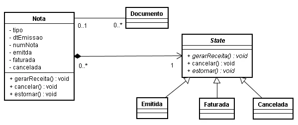 Porém, o Analista que me passou este trabalho me recomendou que eu não fizesse a parte de persistência através dos métodos de NotaState, mas sim a partir do meu Controller. O State está me servindo simplesmente como alguém que só me diz “pode fazer isto” ou “não pode fazer isto”. Desta maneira, em alguns casos, tenho que fazer a “gambiarra” de guardar o Estado anterior para saber o que caminho devo seguir.