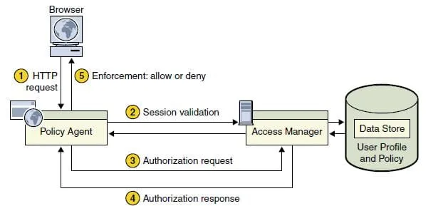 O agente intercepta a requisição, verifica o token da sessão embutida em um cookie e valida o token SSO. Se as credenciais do usuário já tinham sido autenticadas antes, nem sempre é necessário o contato entre o agente e o gerenciador de acesso para validar a sessão. Porém, como às vezes pode ser necessário, então aparece na figura anexa.