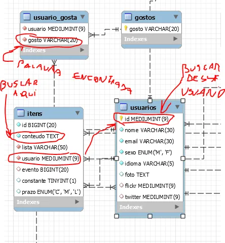 Resumindo: Essa “varredura” deve ser feita na tabela itens, porém devem ser definidos a cada palavra os usuários que contém ela.