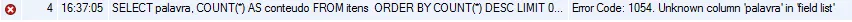 A tabela onde eu estou realizando essa “varredura” pelas palavras mais usadas se chama itens, eu estou buscando no campo conteúdo: